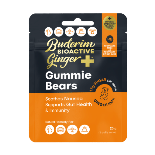 Our Buderim BioActive Ginger+ Gummie Bears help to soothe nausea and support gut health and immunity.