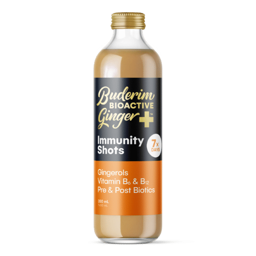 Buderim’s BioActive Ginger+ range contains the most important natural ingredient found in Ginger, 6-Gingerol. Clinically proven to assist in effectively relieving nausea. The BioActive Ginger+ range complements 6-Gingerol with B6, B12, prebiotic fibre and postbiotic type probiotics as the ultimate natural solution to feel better & boost your gut and immune health.
