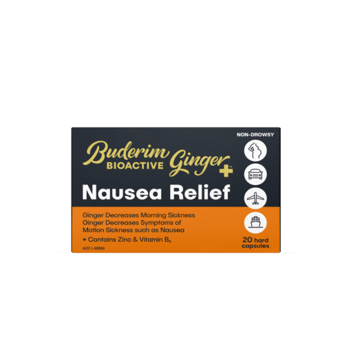 Buderim BioActive Ginger+ NAUSEA RELIEF capsules help decrease symptoms of motion sickness, such as nausea.