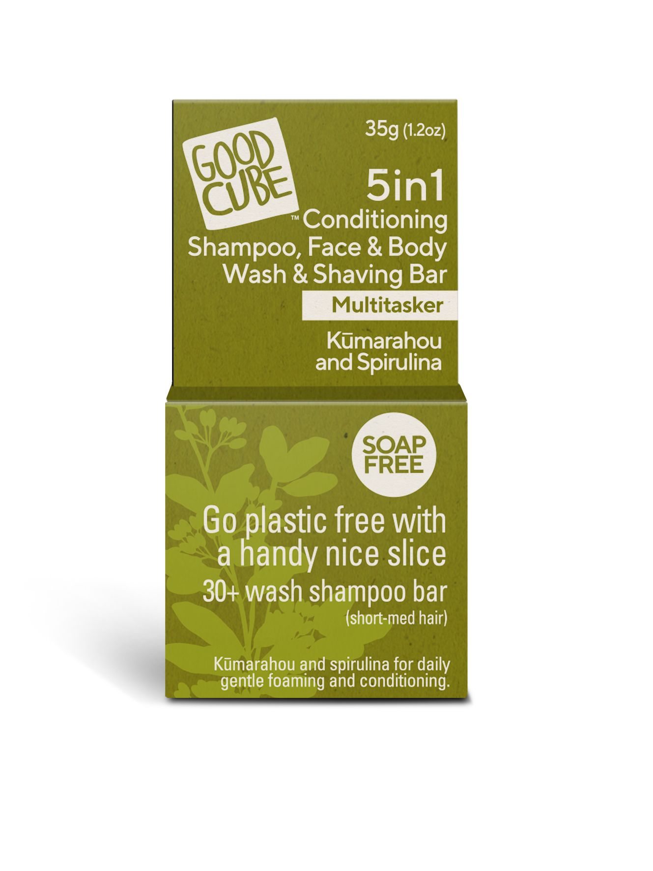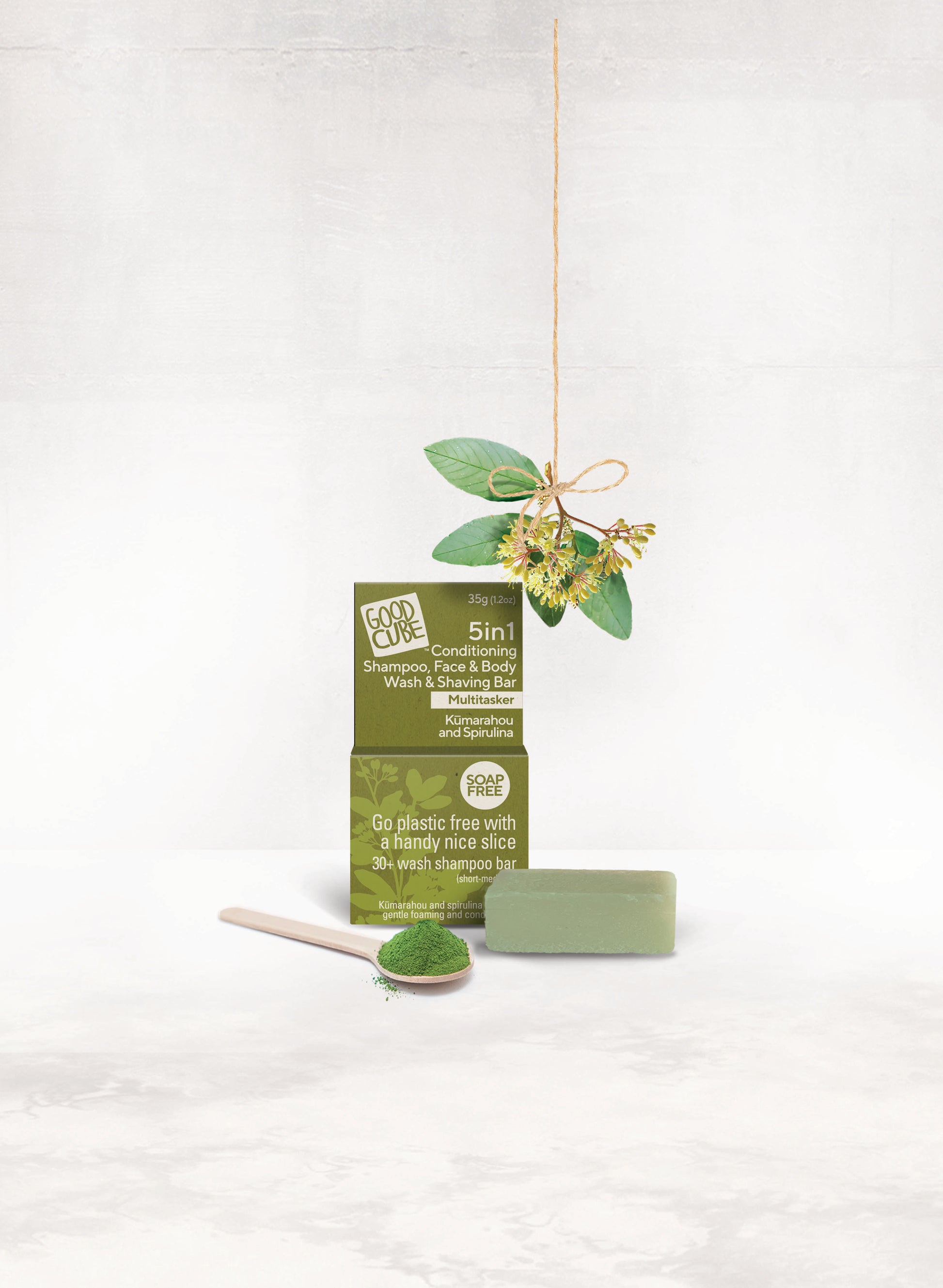 For the daily washing of body and face, washing and conditioning of hair, and perfect for shaving, our Multitasker Cleansing Bar is formulated with clarifying NZ native kumarahou extract, nutrient-rich spirulina and detoxifying green clay.